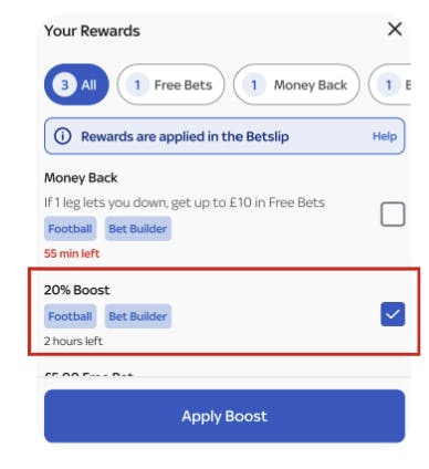 Boosters can be used on most Bet Types and will be shown in Your Reward as seen in the image below, the details of this can be found in the T&Cs of the promotion.