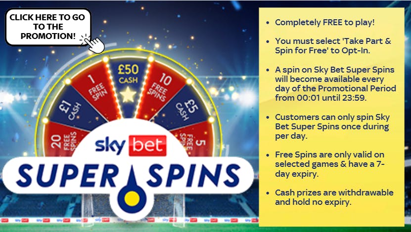 A. A spin on Sky Bet Super Spins will become available every day of the Promotional Period from 00:01 until 23:59, on the promotions page. Customers can only spin Sky Bet Super Spins once per day.