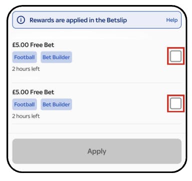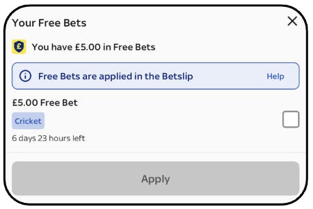 Please note, only free bets applicable to the bet being placed will show. For example, if you're placing a Build a Bet, only free bets eligible for Build a Bet markets will appear. This information is available in your free bet wallet.