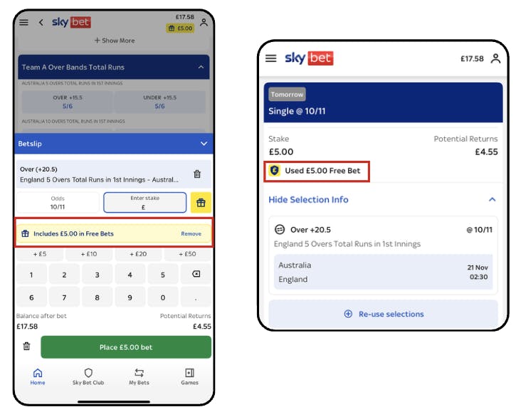 - Whereas, if you had a Cricket free bet and you're trying to place a football bet, this one would not appear.