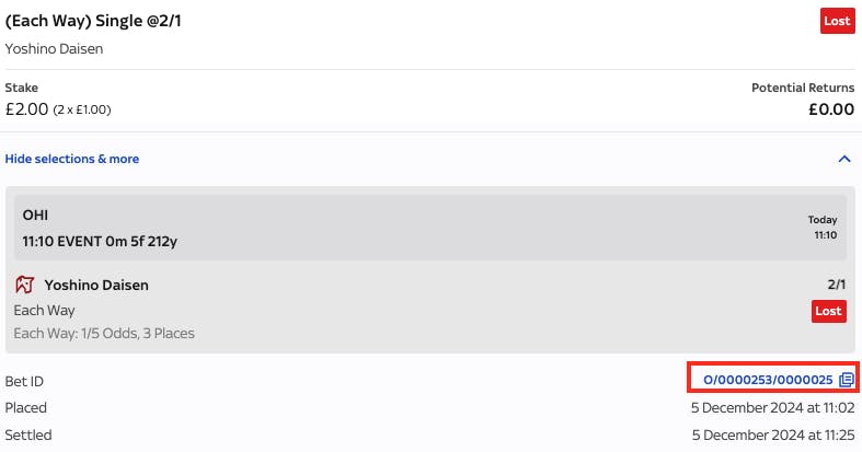 - Click on Selections & More to see your bet details and your bet receipt no. will be displayed, as per the below screenshot.